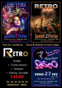 Sur notre piste de 150 m², vous pourrez apprécier toutes les couleurs de la musique avec des programmes « toutes danses » autant que des soirées « à thèmes » (Rock, SBK, Live, déguisées, etc…) pour votre plus grand plaisir de danseuses & danseurs. Que vous soyez danseur(se) l’après-midi ou le soir, seul(e), en couple ou en groupe, venez découvrir les ambiances festives générées tout au long de l’année dans la convivialité & le respect au RÉTRO & vous laisser transporter de joie dans la bonne humeur…